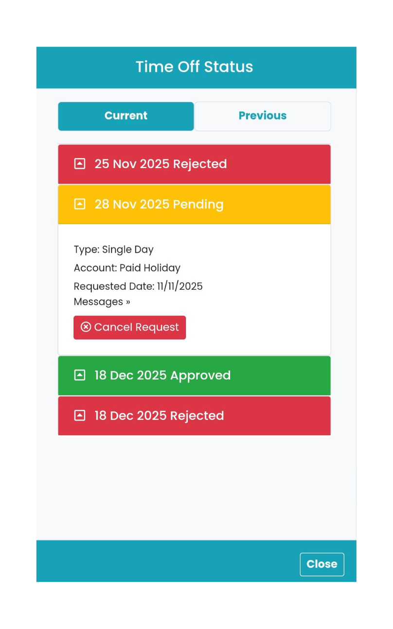 Employees can check the status of their holiday requests and manage pending submissions directly.